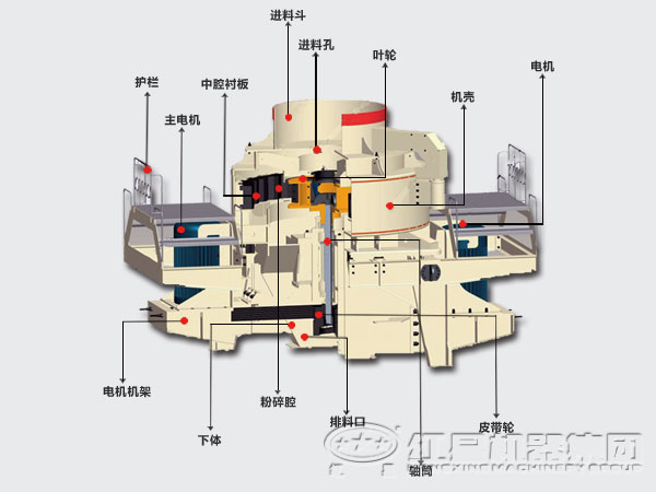 制砂機(jī)一般結(jié)構(gòu):制砂機(jī)主要由進(jìn)料口、溢料裝置、轉(zhuǎn)子、破碎腔、驅(qū)動(dòng)裝置及機(jī)座這幾大部分組成。其工作原理是:物料由進(jìn)料口進(jìn)入破碎機(jī),在破碎機(jī)頂部由溢料裝置將物料分為兩部分,一部分經(jīng)溢料口進(jìn)入破碎腔,另一部分直接進(jìn)入轉(zhuǎn)子,物料以50-80m/s的速度從轉(zhuǎn)子內(nèi)三個(gè)均布的流道口發(fā)射出去,與溢料流發(fā)生碰撞,然后一起沖向破碎腔內(nèi)的物料墊,被物料墊反彈,斜向上沖擊到破碎腔的頂部,又改變其運(yùn)動(dòng)方向,偏向下運(yùn)動(dòng),與溢流石料重新組合,這樣每塊物料在破碎腔內(nèi)受到兩次甚至多次破碎作用,而后從破碎腔落下由排料口排出。在整個(gè)破碎過(guò)程中實(shí)現(xiàn)的是物料與物料的碰撞,有效地減少了磨損。